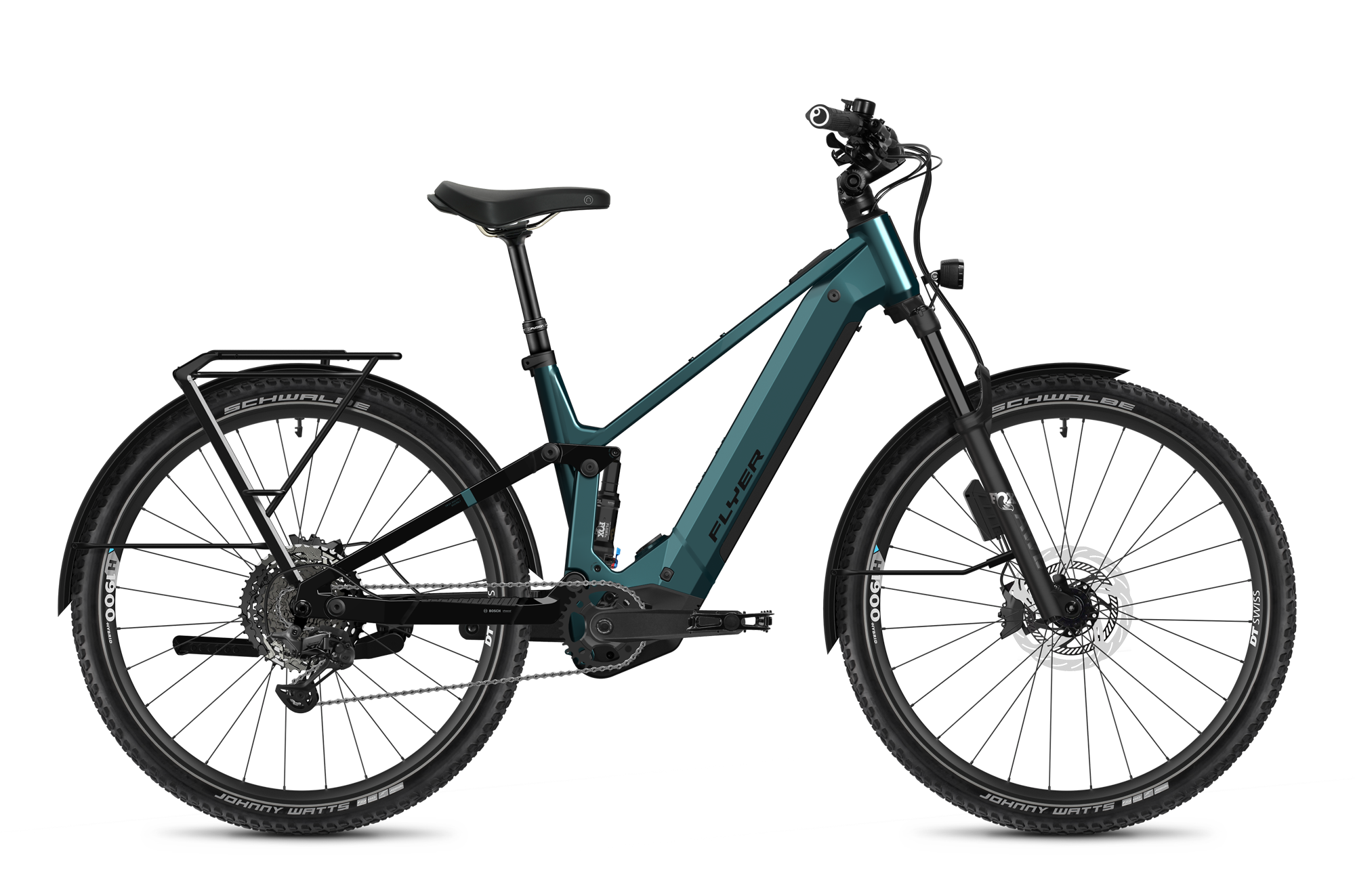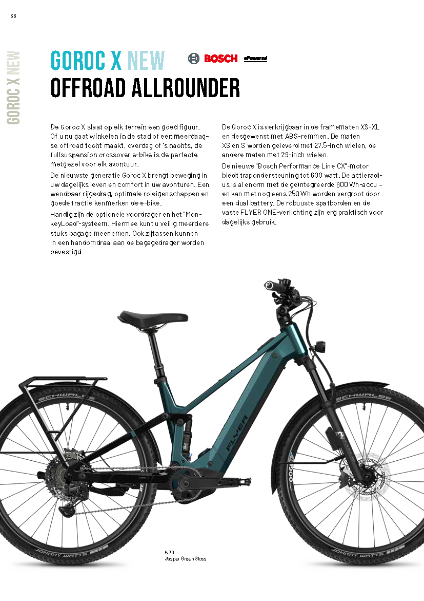De nieuwste generatie van de Goroc X brengt beweging in je dagelijks leven en comfort in je avonturen. De e-bike wordt gekenmerkt door een wendbaar rijgedrag, uitstekende roleigenschappen en veel tractie. Praktisch zijn de optionele bagagedrager voor en het “MonkeyLoad” systeem. Hiermee kun je veilig meerdere bagagestukken laden. Ook zijkoffers kunnen in een handomdraai aan de bagagedrager worden bevestigd. De Goroc X is te bestellen in de framematen XS - XL en desgewenst met ABS-remmen. De maten XS en S worden geleverd met 27,5“ wielen, de andere maten met 29” wielen. Dit maakt de e-bike makkelijk hanteerbaar, afhankelijk van de maat. De nieuwe “Bosch Performance Line CX” motor ondersteunt je met maximaal 600 watt. De actieradius is al enorm met de geïntegreerde 800 Wh accu - en kan worden verhoogd met nog eens 250 Wh met een extra accu. De robuuste spatborden en het vaste “FLYER ONE” licht zijn zeer praktisch voor dagelijks gebruik.